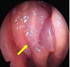 2、粘液性息肉,颇似剥皮葡萄状或鲜荔枝肉状,表面光滑半透明,呈粉红色,有细带多来自中鼻道,触之柔软活动。
