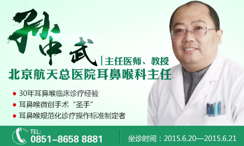贵州省第二人民医院作为贵州省公立三级医院,秉着一切为了患者的理念,满足广大患者的就医需求,特邀请贵州健康产业协会首席医学专家、贵州卫生组织医教部特邀医学专家 、联合国健康联盟组织专家委员会委员、北京航天总医院耳鼻咽喉科主任孙中武教授亲诊。(坐诊时间:2015年6月20日—6月21日)希望广大耳鼻喉患者莫失良机!