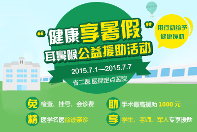 现在耳鼻喉疾病发病率越来越高,其中学生人群占据较高比例,治疗现状不容乐观。恰逢暑假,莘莘学子开始享受快乐暑假,关注耳鼻喉疾病的治疗,因此,贵州省第二人民医院在这最特别的暑假日子里,为了响应公立医院的公益号召,为传递关爱和温暖,回馈广大耳鼻喉患者,特推出“健康享暑假”耳鼻喉公益援助活动,为暑期耳鼻喉患者送去健康的希望,享受美好的时光! (活动时间:2015.7.1—2015.7.7)
