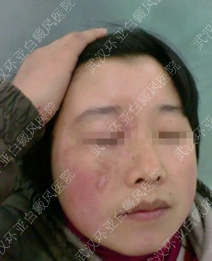▲病史:半年前,面部突然一个豆大白斑点,慢慢扩大。涂抹外用药治疗无效来我院治疗