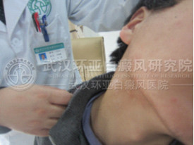 复诊:6周后,患者白斑区域的黑色素颜色接近正常肤色,但是周边出现新生的白斑,医生当即决定增加一个疗程的药离子巩固药物吸收以及皮下微循环巩固调节。